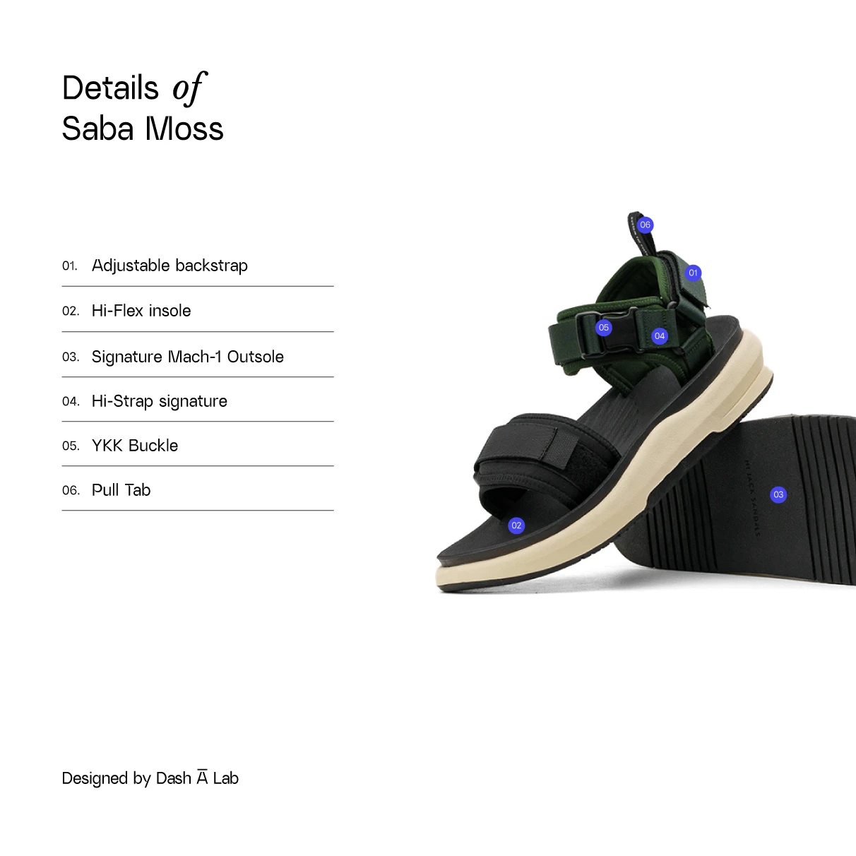 A classic two-strap sandals construction for flexibility in your stroll. Enhanced with Hi-Flex insole and signature Mach-1 sole for comfort & YKK buckle, and a detachable back strap for function. In a calm Moss colorway made for your all-day-long stroll to walk further.